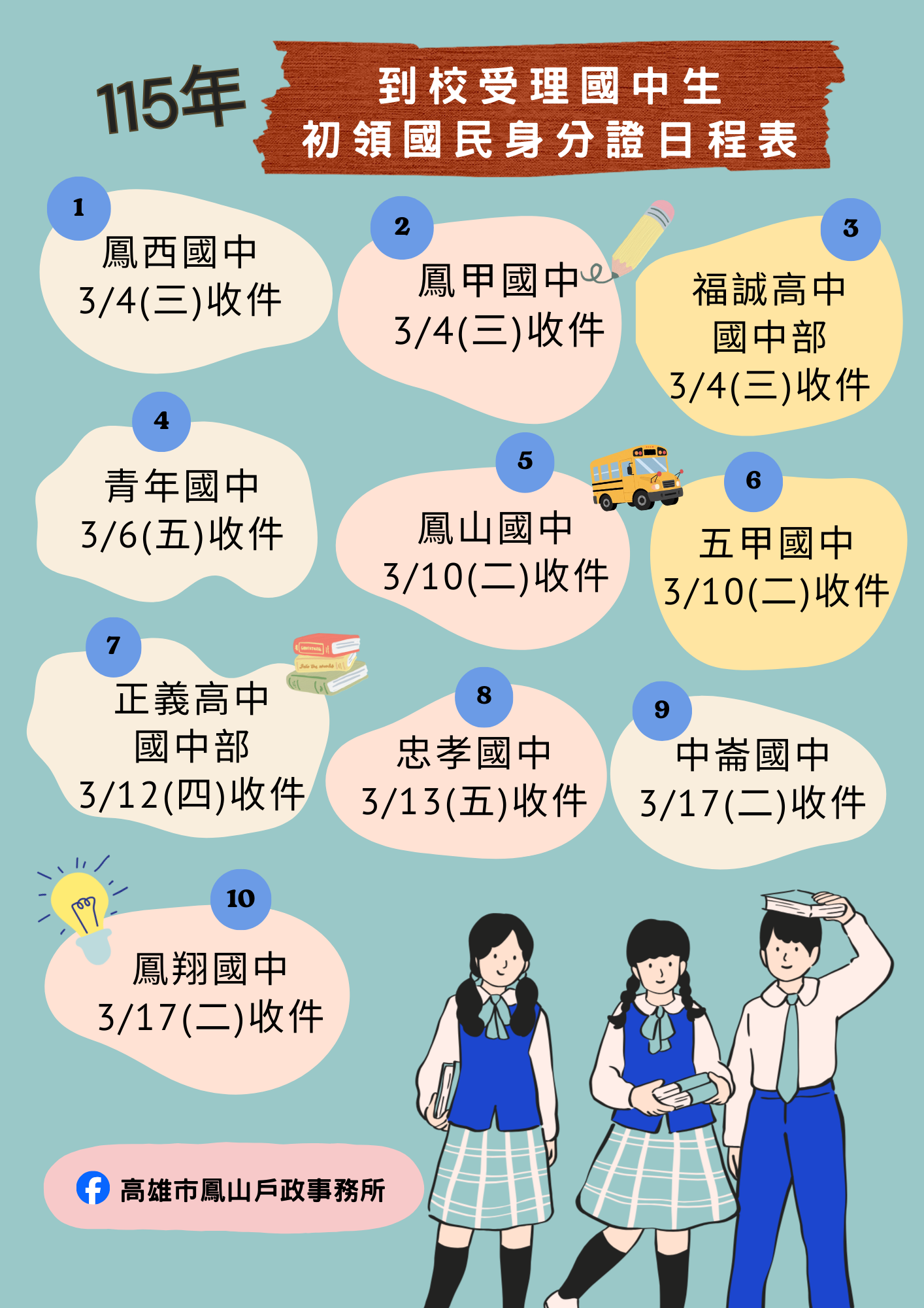 為落實便民服務,減輕學生及家長往返戶政機關之不便,本所訂於115年3月4日至3月17日,派員前往本區10所國民中學,辦理初次領取國民身分證申請作業。